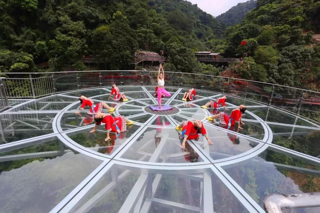 懸空玻璃平臺全長202米,以72米的懸空跨度名列世界第一,為美國科羅拉多大峽谷的U形橋(21米)的3.5倍;點睛之筆是平臺頂部直徑16.8米的玻璃觀景圓臺,這是和瀑布親密接觸的絕佳位置。圓臺中間獨具匠心地設計了網格狀鏤空,山風穿透,頓生寒意;踏步其上,如墜深淵,令人心驚膽寒。